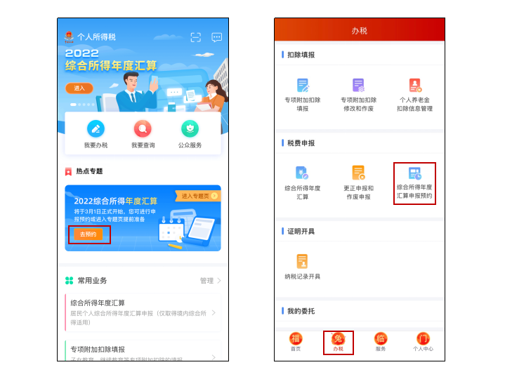 第一步,纳税人登录手机个人所得税APP后,可通过“首页——2022综合所得年度汇算”专题区域点击“去预约”进入预约功能页面,也可以通过“办税——税费申报——综合所得年度汇算申报预约”进入预约功能界面。