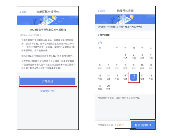 需要说明的是,预约功能开放时间为2023年2月16日至3月20日每天的早6点至晚22点,纳税人可在上述时间内登录手机个人所得税APP并预约3月1日至3月20日的年度汇算申报。