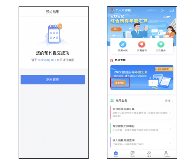 第三步,提交成功后,系统显示“您的预约提交成功”页面,纳税人即可在预约日期当天办理2022年度汇算申报。此外,还可以在手机个人所得税APP首页年度汇算专题栏查看预约情况。