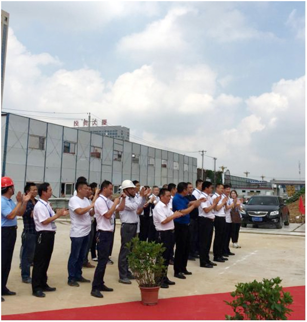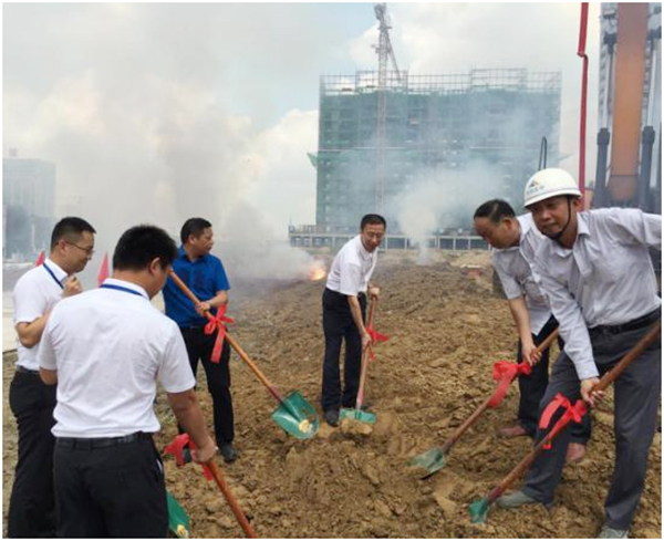 余总、多金集团副总经理童飞、多金集团设计总监叶凡、安徽同花顺官网建设工程集团有限公司总经理王越及科创监理等一行培土奠基并合影留恋